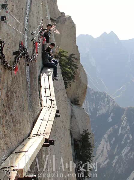 长空栈道位于华山极顶南峰东侧南天门外的山腰间,上下皆是悬崖绝壁,仅仅在崖壁上凿了些固定点,用木板搭成一个百余米的悬空栈道,下面用石柱稍加固定。栈道太过狭窄需要侧身行走,稍微向外探出身去,就能看到深不见底的悬崖。道路两旁装有铁链,也可以在上栈道之前租用保险带,安全还是有一定保障的。不过如果有恐高症,或是没有很好的体力和勇气,还是不要轻易尝试了。