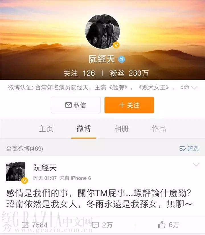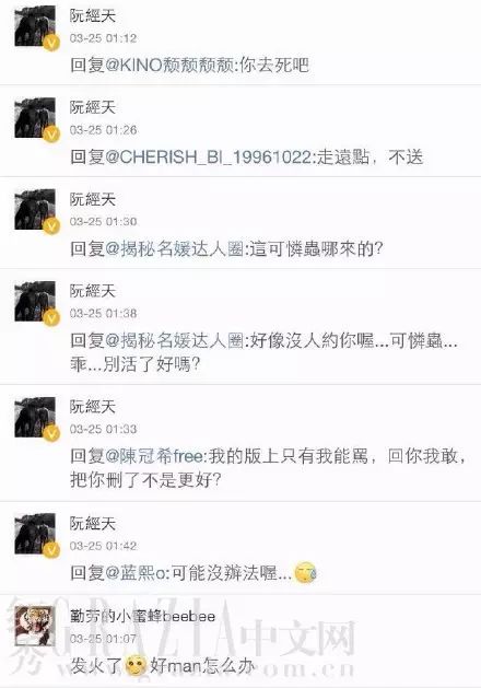这只是前戏,真正精彩的在后面。发飙的阮经天发了微博不忘关心留言,在评论中和网友展开口水战,爆出粗口称“你去死吧!”“我的版上只有我能骂,回你我敢,把你删了不是更好?”等留言怒呛网友。