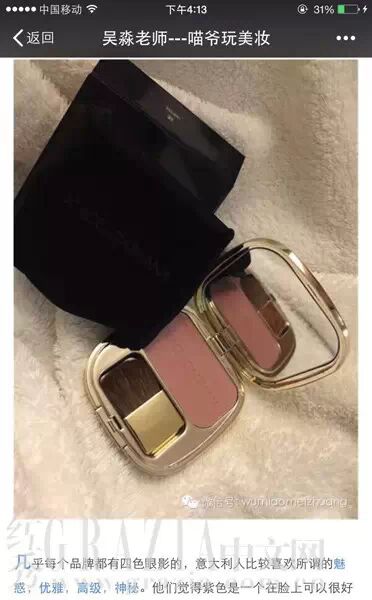 DG腮红,DG的彩妆并不是彩妆界的主流产品,那他为什么要买?DG的彩妆有个好处,质地和质感都不是主流欧美产品的感觉,你们有没有发现美国产品普遍有个质地会比日系产品更为粗一点的感觉,在这点上,DG做的很出色,他特别用了某国比较牛B的机器来做这些质地更为细致的产品,单说这块腮红就可以媲美POLA的质地,但是这块腮红没有珠光的效果,也更多是因为意大利人对彩妆的要求就是上色度更好一些,服帖感更好一些,而对珠光的光泽感却没那么高的要求,(如图)这个颜色是35#,也不是那种特别粉嫩的感觉。看上去是偏砖红色的感觉,不过这个颜色用起来的效果却是万用,真正的能文能武,文能装萝莉,武能做烈女的腮红!