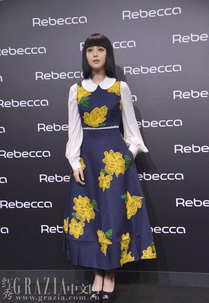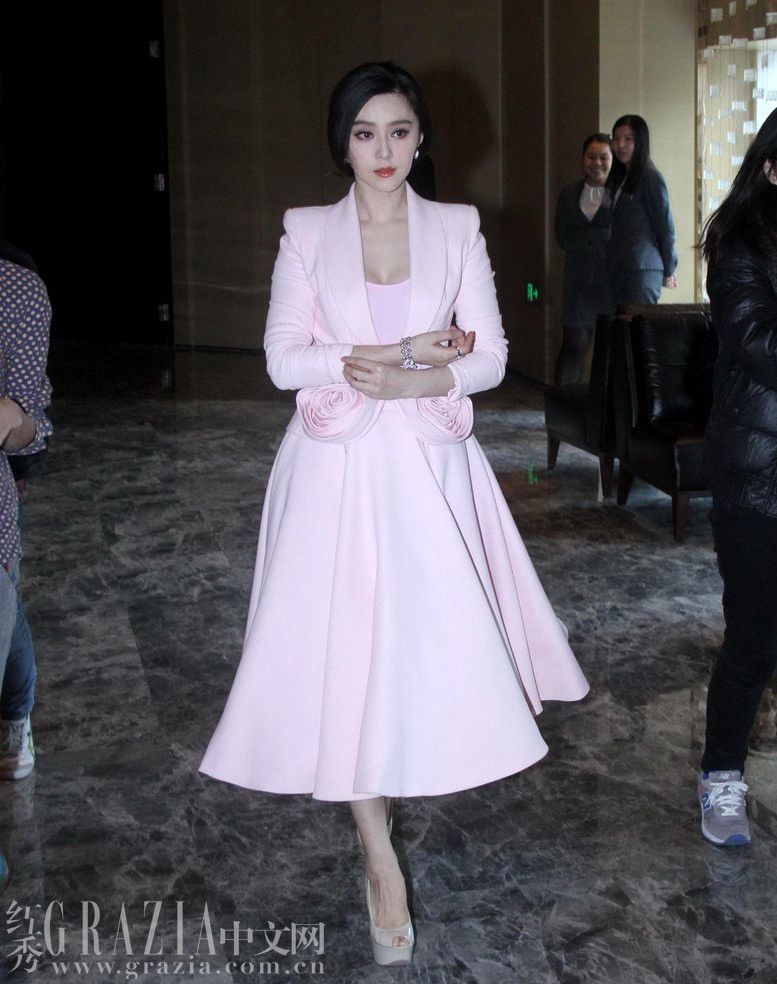 即使是套装,冰冰也一定要选收腰的大摆裙。耸肩的设计和裸色的防水台高跟鞋是拉长整体高度的好方法。