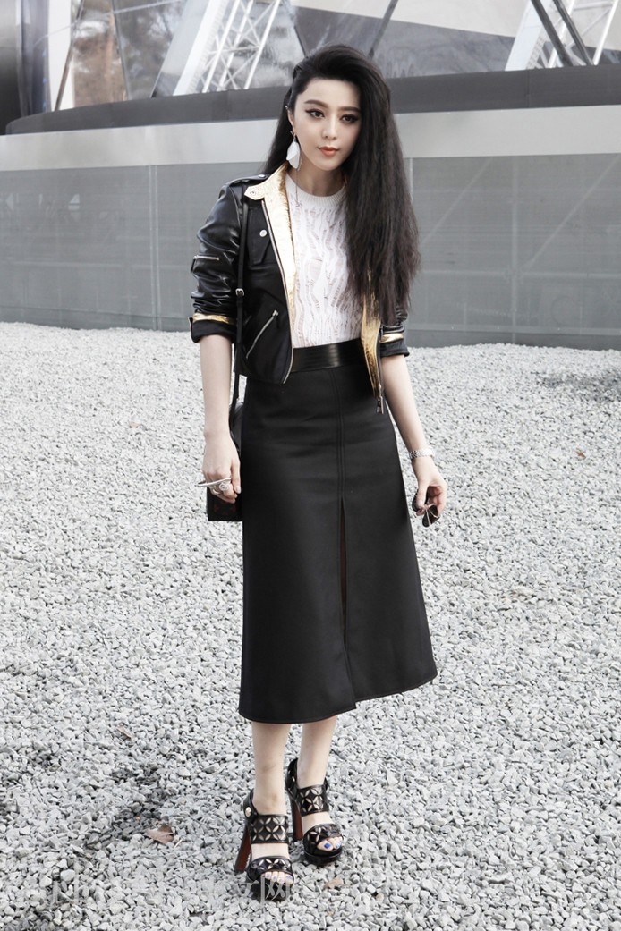 除去扮年轻这件事,范冰冰在扮酷上也是非常有自己的一套。大家都知道拨到一边的长发最动人,是塑造瓜子脸的神器!而挑选一件紧身夹克,搭配平滑腰线的半裙无疑将整体身高拉长了好几公分。