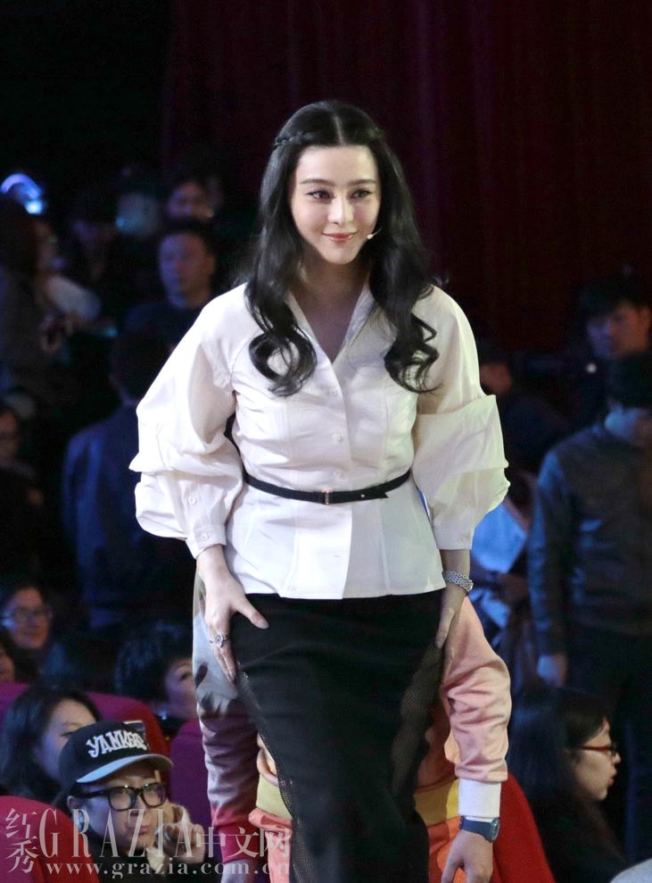 在《出彩中国人》的节目录制现场,范冰冰选择了铅笔裙和泡泡袖上衣的组合,腰间的黑色皮带起到了将视觉拉高的效果。而颜值巨高的冰冰不正需要这样的效果吗。