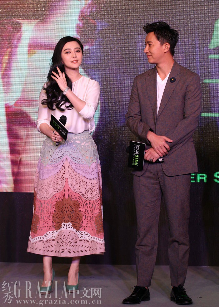 电影《万物生长》发布会现场,范冰冰选择了一条镂空蕾丝的马卡龙色半裙,搭配一件简单的上衣。乍看之下是非常普通的装束,但是当冰冰坐下来之后,我们就能看到完美的拍摄效果。