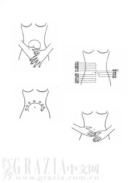 2.双手中、食、无名指背对背点压腹部穴位,配合腹式呼吸,在每个穴位停留3-5秒。