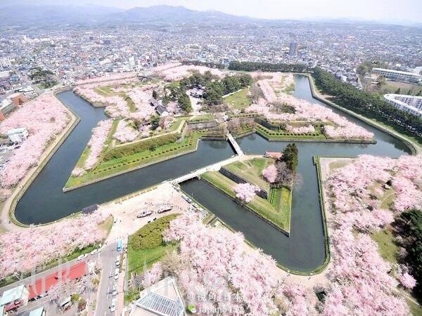 五稜郭是江户幕末期以法国的城楼为模型建造的星型城楼,在世界上也属罕见。星型的护城河旁种植着大约1600棵樱花树,这里的看点之一就是倒映在护城河水面上的樱花美景。(入场免费,开放时间9:00---18:00)