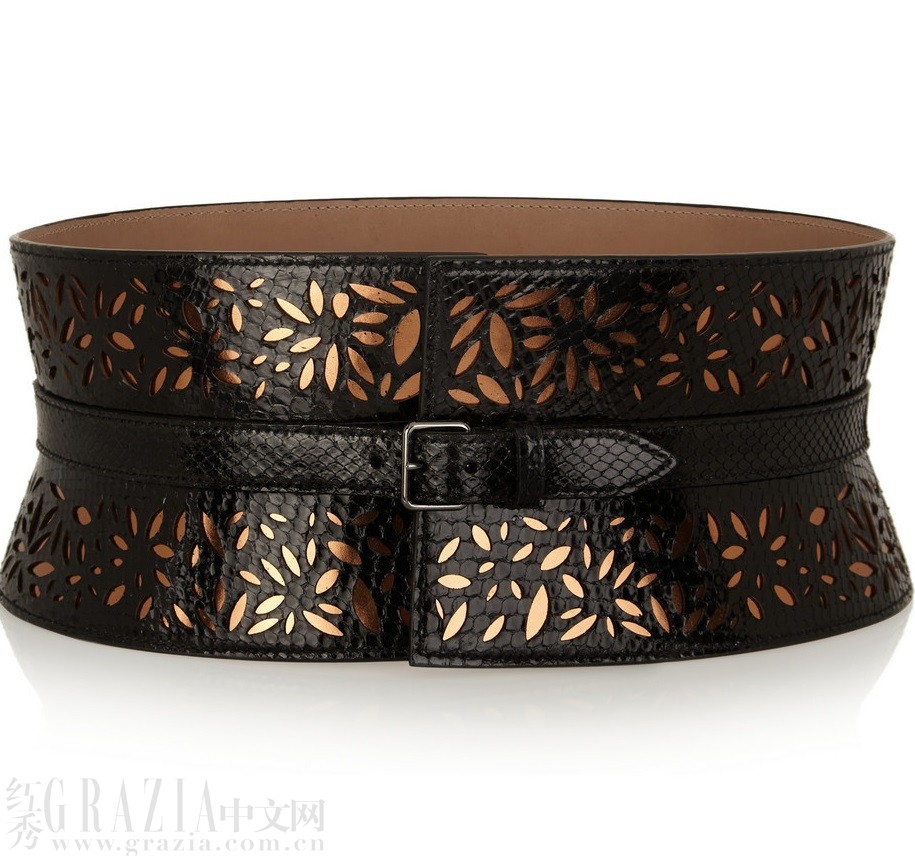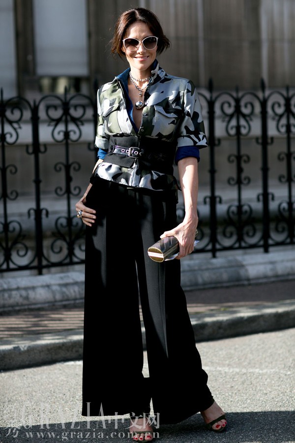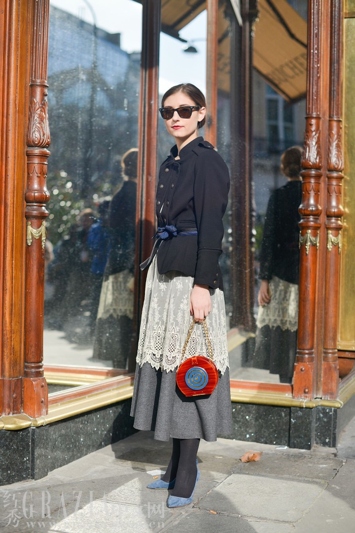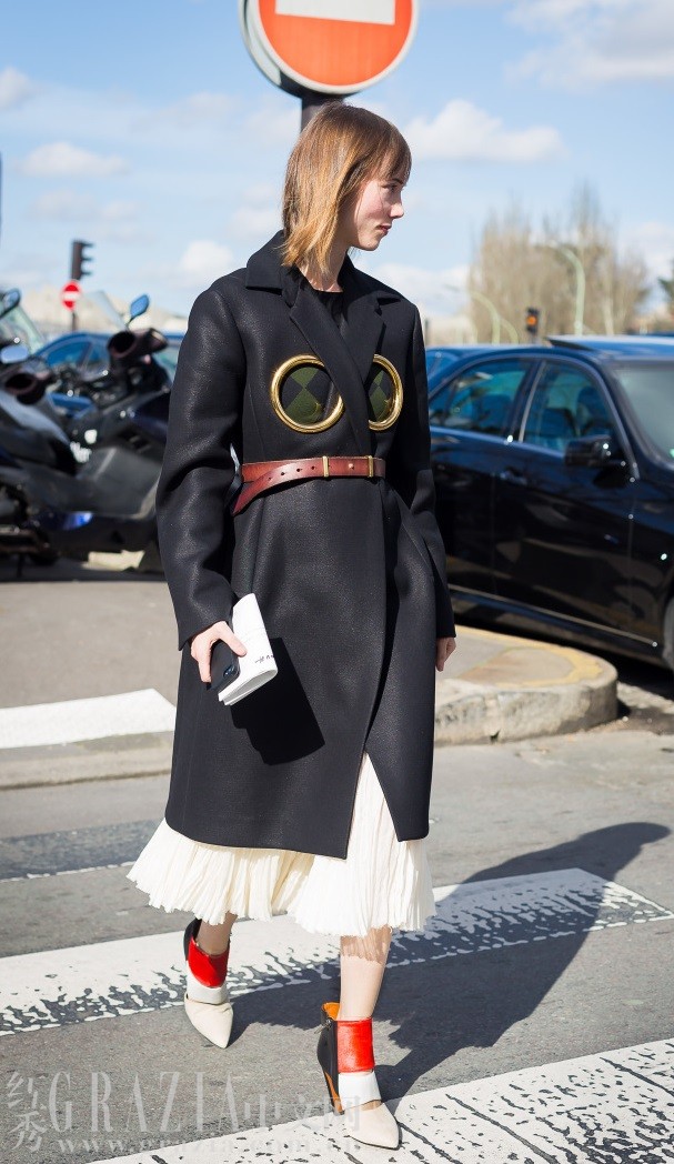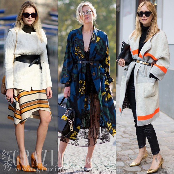 腰带是分割两种风格的最佳利器,也是融合两种风格的利器。如果你选择了夸张的半裙,不妨在外套外系一条颜色与整体不同的腰带,会有意想不到的效果。