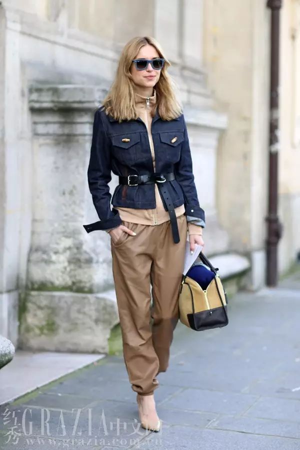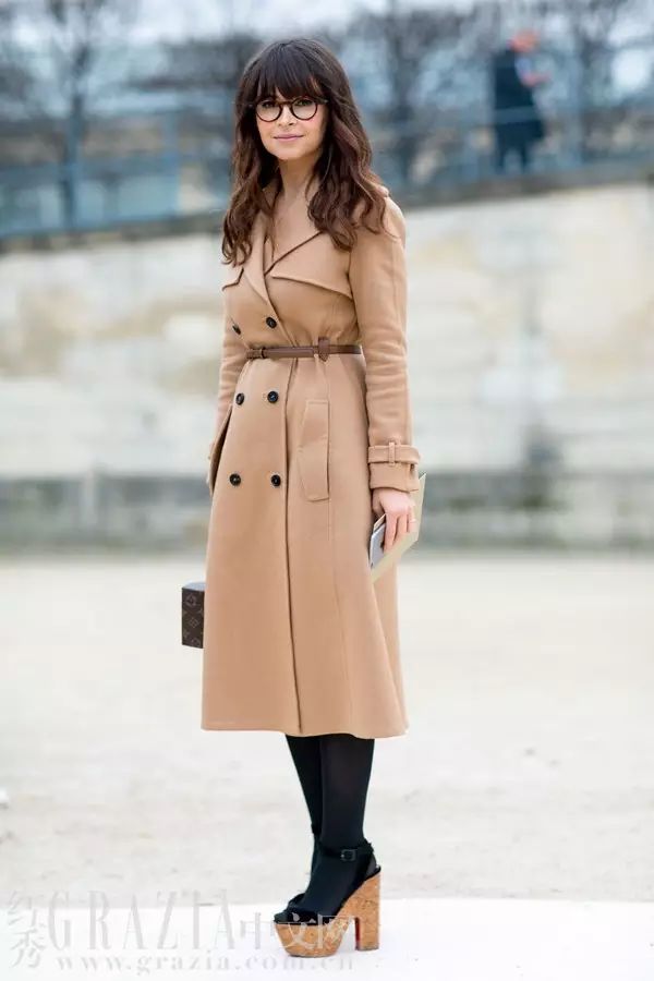 经典的驼色外套想穿出年轻的感觉,只需搭配同色细腰带再戴上圆框眼镜就行。