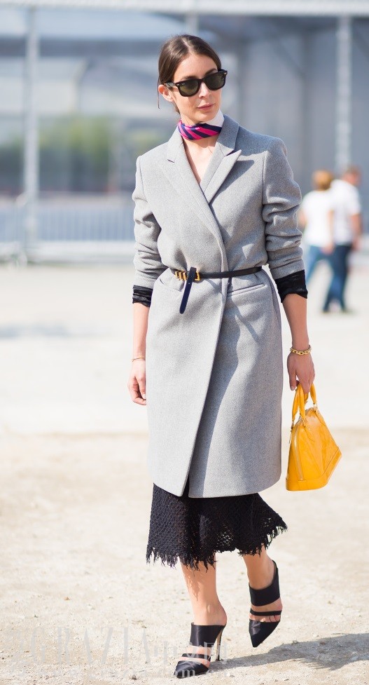 觉得灰色的大衣过于单调硬朗,不妨系上金属元素装饰的腰带,再搭配一条色彩明亮的真丝围巾,瞬间柔和严肃的通勤风。