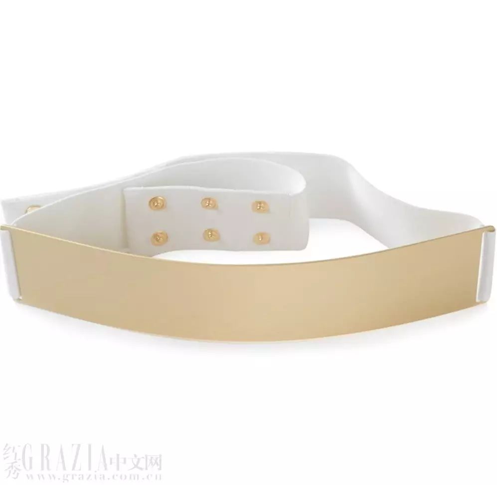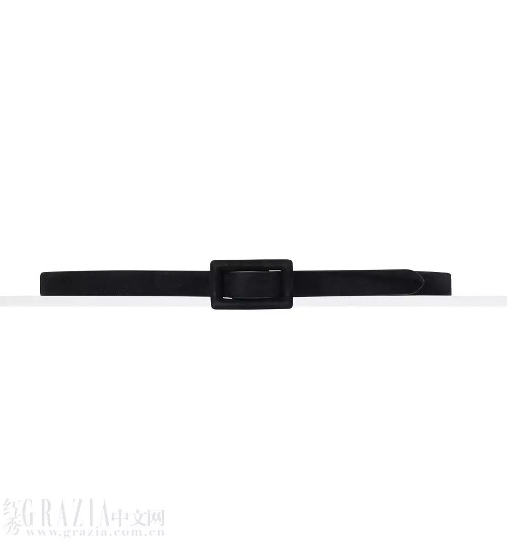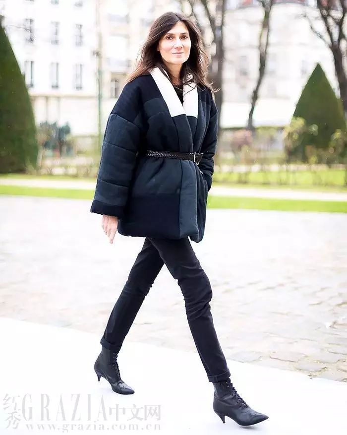 浅色外套搭配全黑内搭似乎有些不协调,扎一条金属片装饰腰带就能解决。