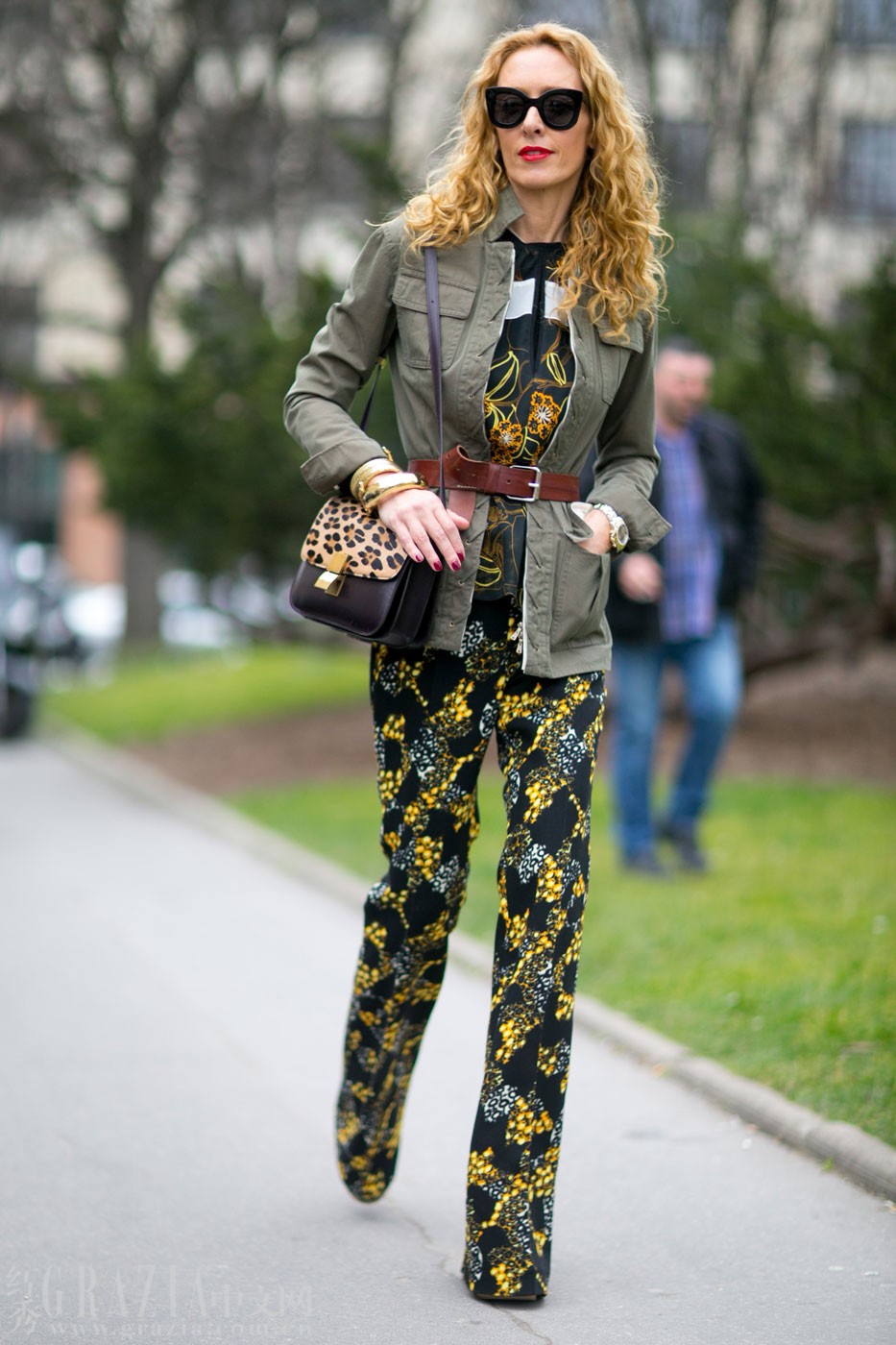 想在春日演绎丛林自然风,不妨试试挑选一件印花连身裤,搭配军绿色短外套和棕色皮带。