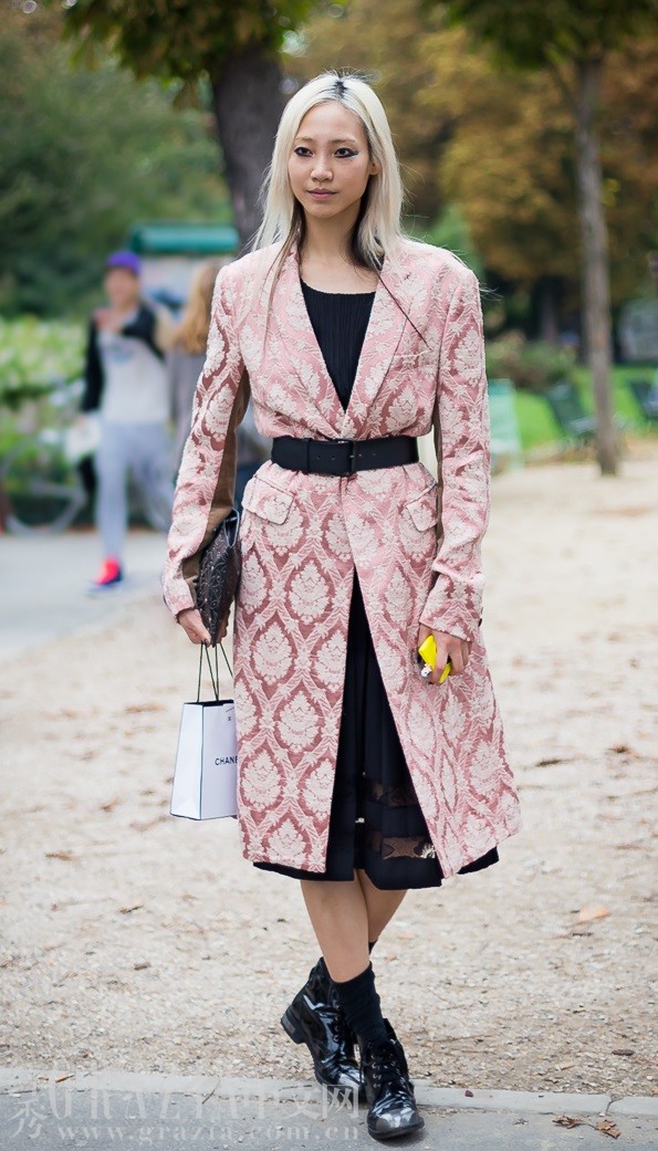 听说过粉色外套演绎摇滚风吗?只要一根粗腰带和一双机车风皮靴就可以做到。