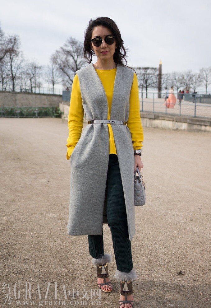 金属片腰带与长款呢料背心的组合,非常适合荧光色的上衣。