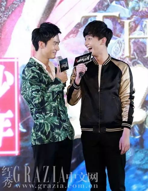 茅子俊身穿热带印花西装出席《少年四大名捕》发布会。