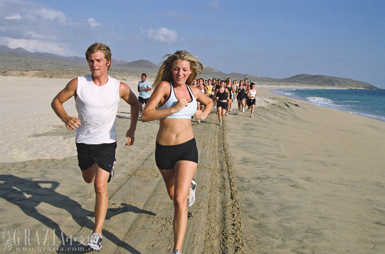 沙滩跑步最关键的是一条透气贴身的运动短裤,不过要注意防晒哟。