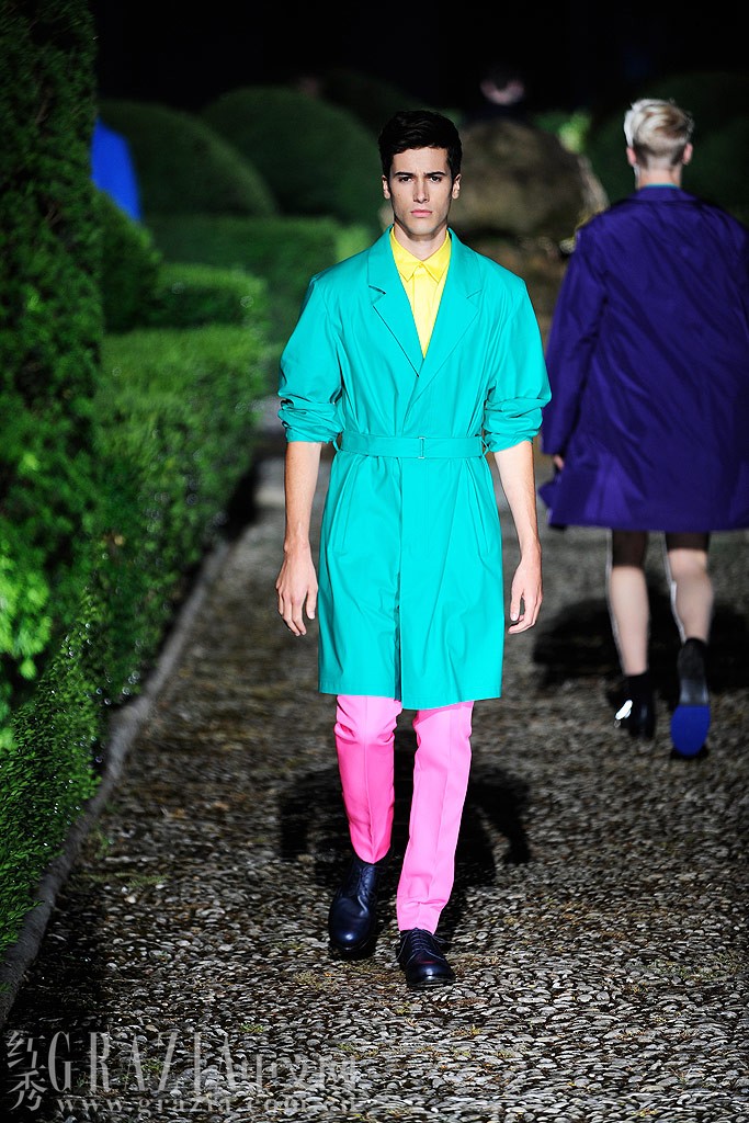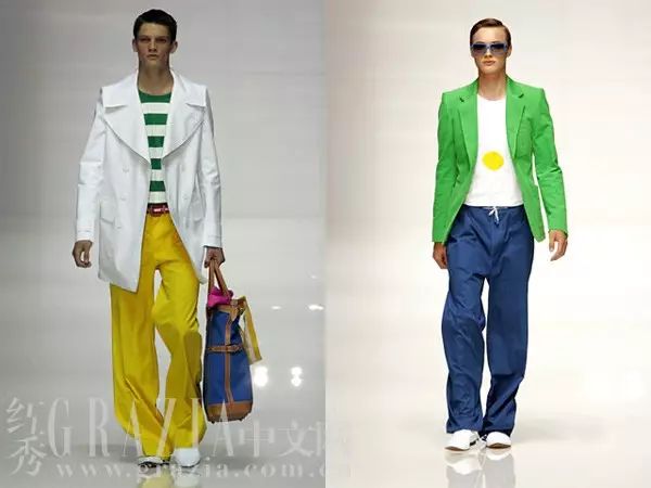 而亮绿色外套和粉色长裤的搭配则是大卫·霍克尼(David Hockney)1964年的作品《Man Taking Shower in Beverly Hills》画作中窗帘和地毯的色彩组合。
