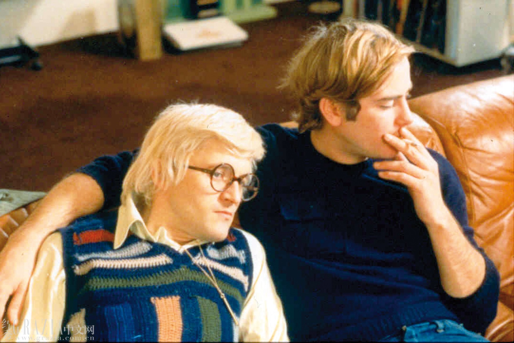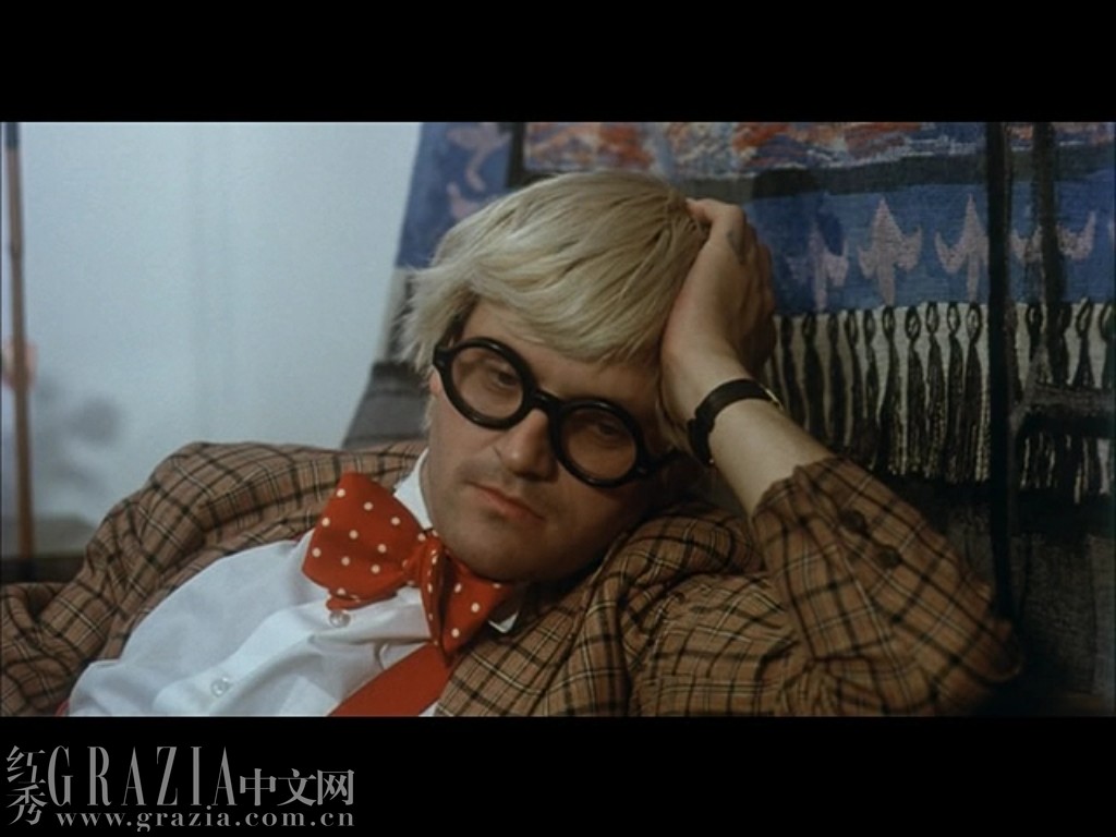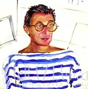 色彩鲜艳的条纹上衣,是大卫·霍克尼(David Hockney)自己在1973年主演的影片《A Bigger Splash》的形象重现。