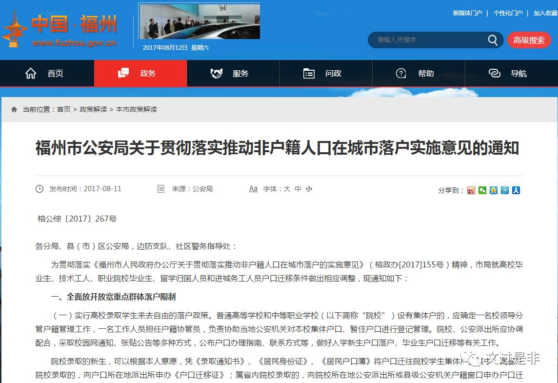 8月11日,福州市公安局通过福州市人民政府官网"中国·福州"发布“福州市公安局关于贯彻落实推动非户籍人口在城市落户实施意见的通知”。