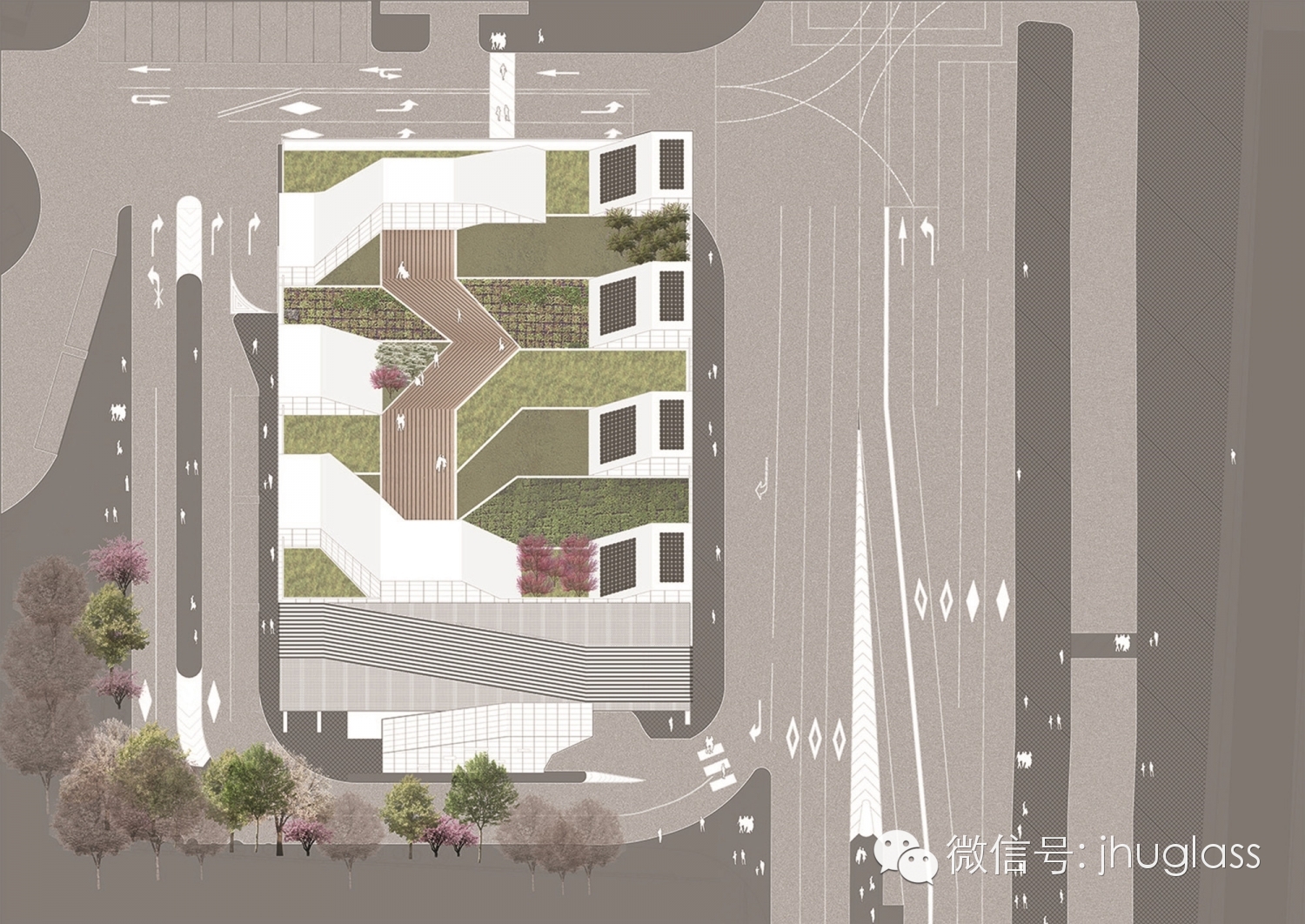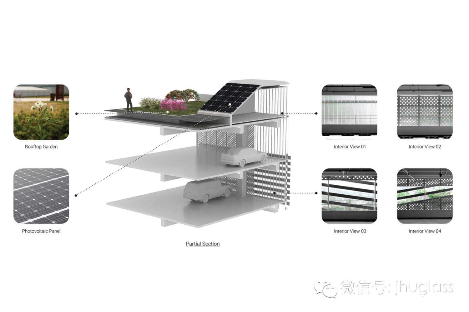 在这个项目中,对停车库的思考是从反思建筑围护结构的性能开始。道峰山交通换乘中心的围护结构使用了一系列的分隔带,形成一种与城市周边环境相协调、而不是支配的视觉语言。7块带状围护结构由3种透水材料组成:半透明的U型玻璃通道、穿孔金属板和金属百叶窗。这三种材料有助自然通风和引入自然光线。虽然这些材料在周边住宅区中显得与众不同,但它们共同塑造了一个光亮的、通风的、亲切的建筑,降低了大型停车库惯有的存在感。该项目成功地展示了一种新型停车建筑,它证明了停车库可以不仅仅用于停泊更多的车辆,还可以是一个新型社会场所。