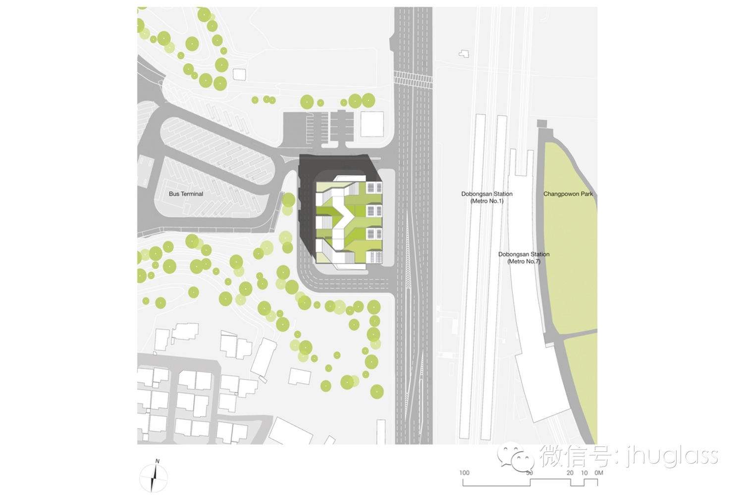 这是由CoDeAU + Namoa Architects设计的道峰山交通换乘中心,位于首尔和议政府两大城市边界,是一个新的交通转换中心。这个新转换中心旨在为乘客提供一个从私人交通换乘到公共交通(巴士或地铁)的转换节点。客户期望在该建筑内设置类似咖啡厅、休息室等公共设施。这个停车库不仅是作为通勤者的换乘节点,还作为连接人与人之间、人与城市之间的场所。因此,该项目不仅仅是提供存放车辆的中介场所,还要将换乘节点的概念延伸至通勤者的公共空间。