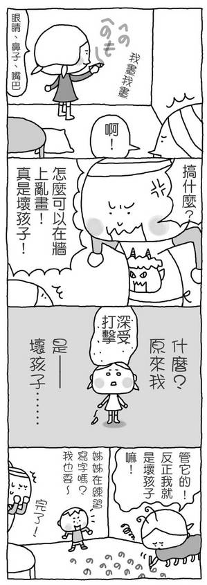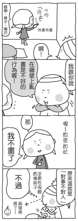 “在墙上乱画是不好的行为喔。”这句话指的是“行为不好”,所以是“对事不对人”。孩子本身没有错,不好的是行为,请爸妈纠正时务必要分清楚。如果让孩子认为自己“是坏孩子”,他被骂后仍然不了解要改善什么行为。只是为他贴上负面标签而已。
