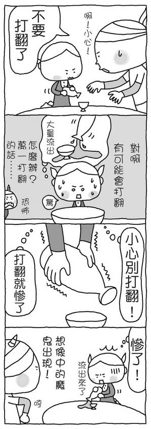 这些提醒其实形成了负面暗示。“可能会打翻”的联想,引导想像走向事实。我一再耳提面命的叮咛,完全徒劳无功。其他类似的状况如下: