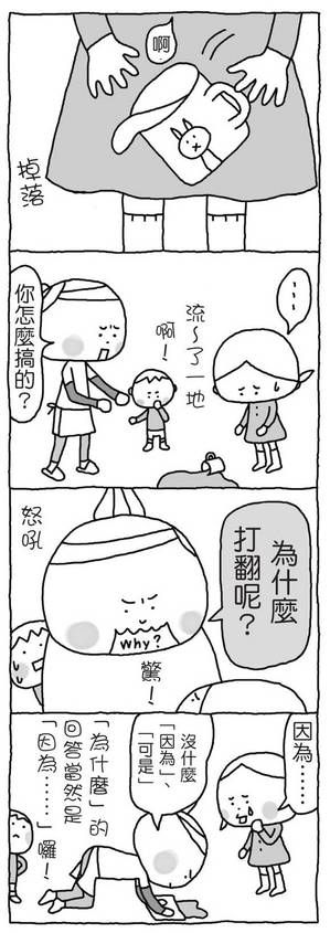 “怎么办呢?”这句话是从一位妈妈朋友那里学来的。当我这么问,两个孩子有什么反应呢?是的,两个人拿了抹布来擦地板!虽然他们用干抹布擦地板,反而扩大牛奶泼洒的范围,但这和我质问“为什么”的情况简直南辕北辙。