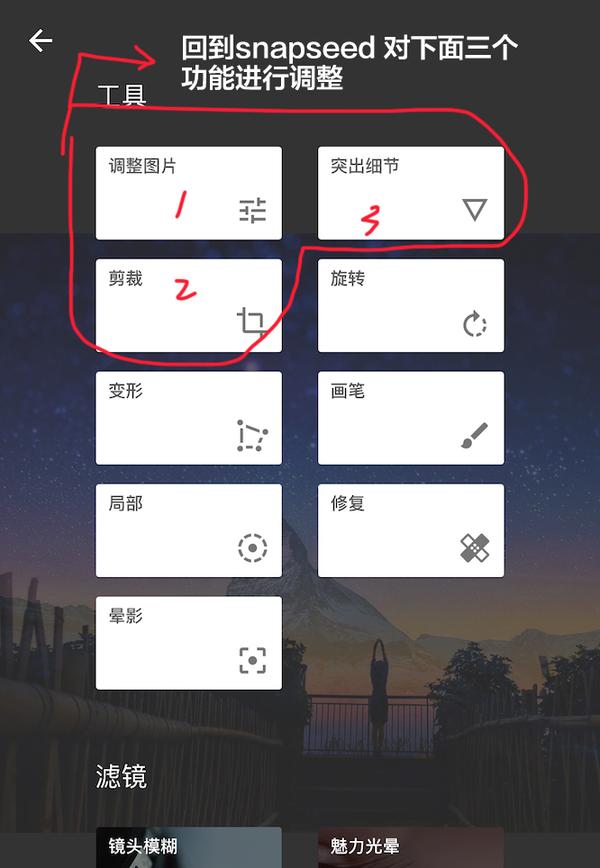 6.最后一步我们把处理好的照片再放入snapseed中再次对图片进行调整,提高照片的质量!这边我们就不对snapseed过多讲解,大家可以多练习下,尝试的去用里面的各个功能选项。