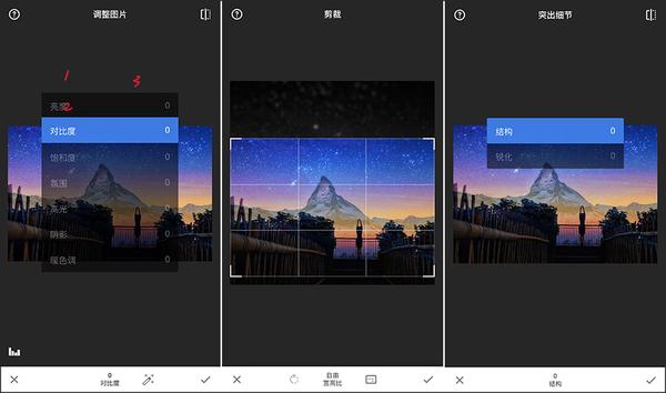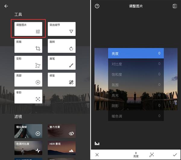 在snapseed中打开图片,先进行一些基础处理,提高画质,这张照片我拍的是接近剪影的效果,这边我在“调整参数”里面 提高画面的饱和度和剪影效果