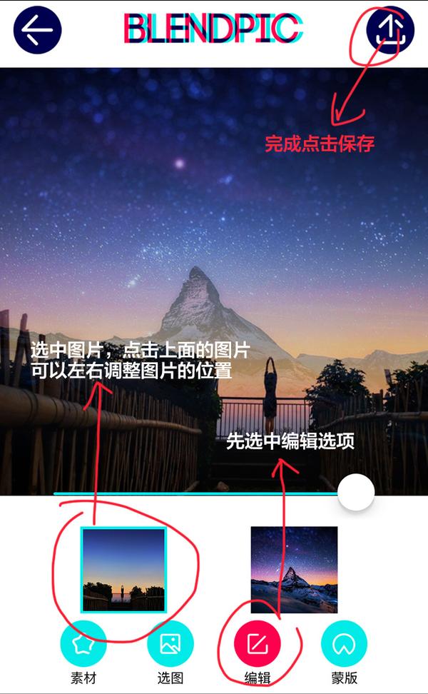 5. 选中“编辑”选项,点击图片,在叠加的图片中,可以对我们所加入的图片进行左右位置调整,完成后点击保存!