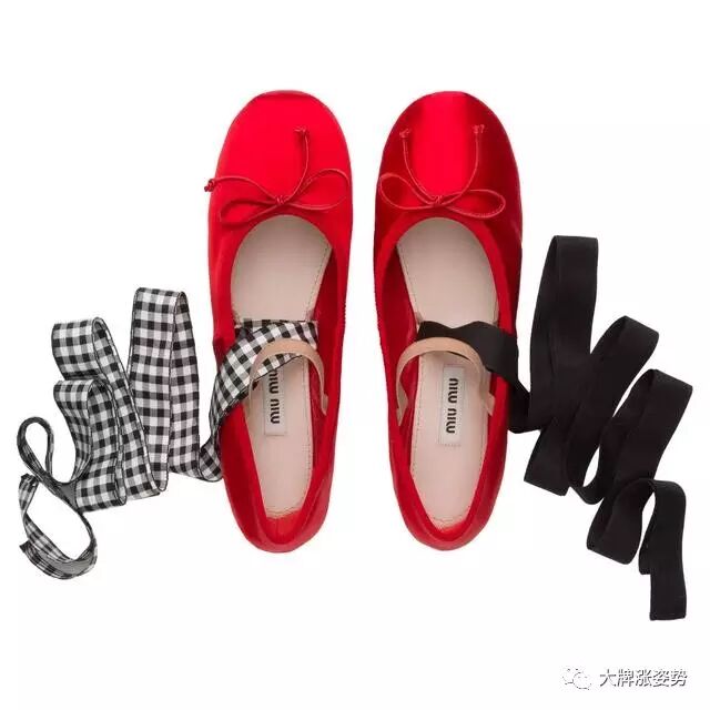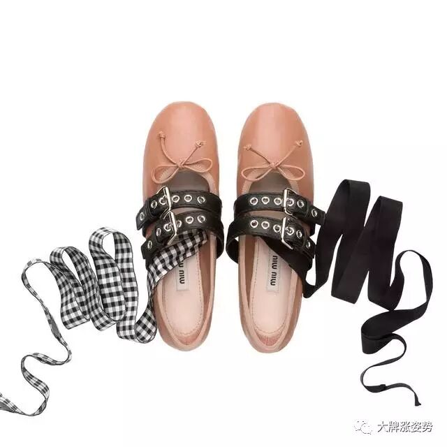 MIUMIU 的这双芭蕾鞋很有意思,用了全平跟的设计,粉丝的面料看起来也很小女生。但似乎为了向芭蕾鞋靠拢,还是增加了“绑带”的细节,只不过没有再采用很女性化的丝带设计而是用了酷酷的黑色皮革。这样看起来这双鞋搭个牛仔裤什么的应该完全不是问题。