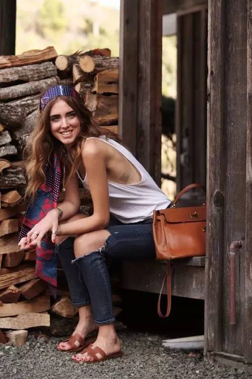 偏中性的搭配风格让你穿的比男友还帅,如果想带有一点女生的柔美气息可以学习美妞博主Chiara的方法,绑条丝巾在头上,新潮又好看。