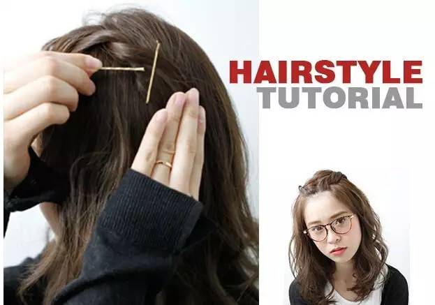 第二款发型头顶的头发扎成扭转的小辫子,金色的发夹即可起固定作用又能装饰发型,空气感的刘海加上发尾处小小的卷翘,配合大大的眼镜带来青春又活泼的感觉。