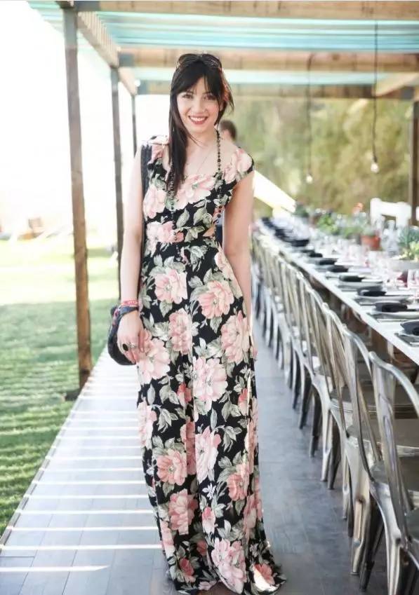 充满花朵的长裙富有风情,色系选择得当有提亮肤色的效果,配饰和发型都是点睛之笔。