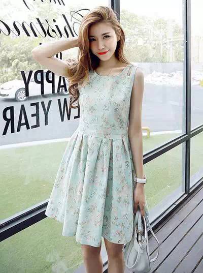 清新感十足的浅蓝色印花背带裙,有种韩系风格的韵味,百褶裙摆设计,修身裁剪,轻松穿出好身材,搭配凉鞋,拎着薄荷绿手袋,更是温柔可爱。
