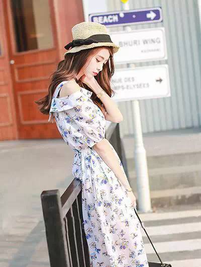 小清新风格的露肩印花裙,荷叶边装饰的领子,加上温柔的露肩设计,透着邻家女生的气息,很有淑女味道,收腰裁剪,中裙长度,上身美丽动人。