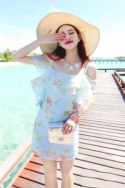 荷叶边装饰的印花雪纺连衣裙,吊带款式,超短裙的设计,清新素雅,清凉好看,搭配宽檐帽,去海边度假这样穿,浪漫唯美,透着女神范儿。