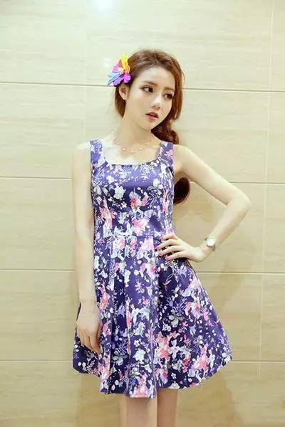 紫色印花背带裙,靓丽十足的印花元素,穿在身上明媚多姿,很有少女风格,A字版型最显瘦,尤其是腰腹有肉肉的女生,选择这样的裙子款式立马显瘦。
