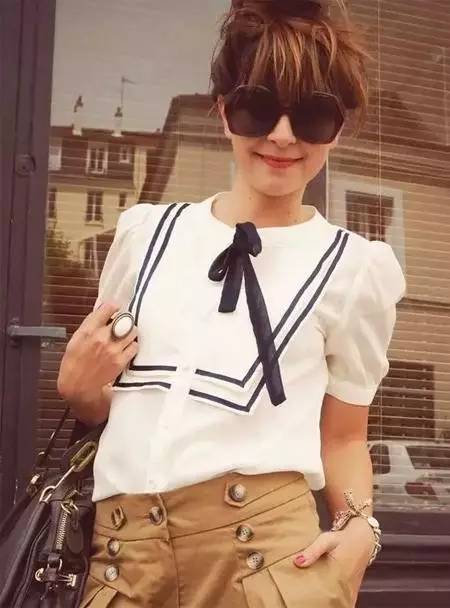 风光明媚的好天气是出航的好日子,这样春夏的服装设计经常可见水手服元素,让人行走在都市丛林中,也能拥有出航的好心情。水手服结合蝴蝶领结,减龄力度百分百!