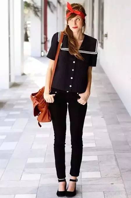 深蓝色大翻领水手服搭配一身黑,红色发带绑成蝴蝶结模样作为点缀,大开你的时尚个性细胞。