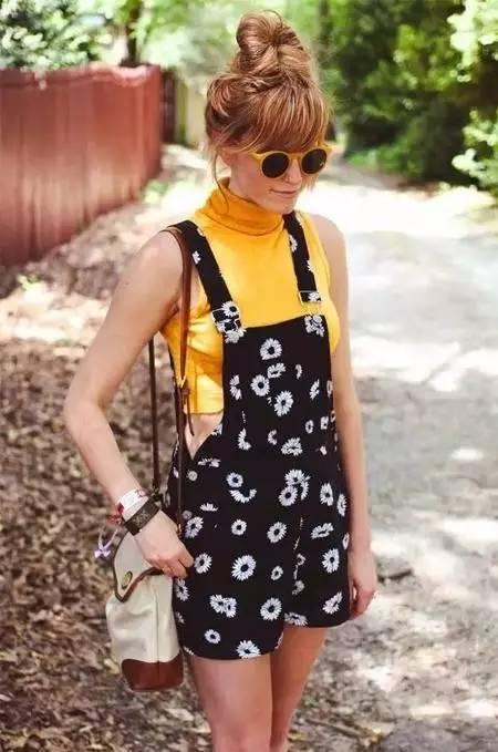 相比长款的背带裤,短款的背带裤其实对身材的影响并不会很大,好身材一样可以尽情展示,青春又有活力。印花背带裤搭配亮眼的黄色短T,减龄功力double!