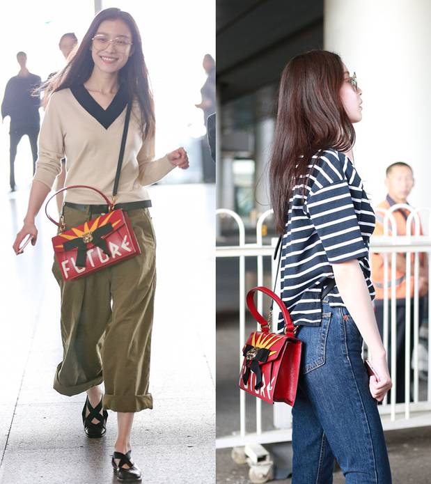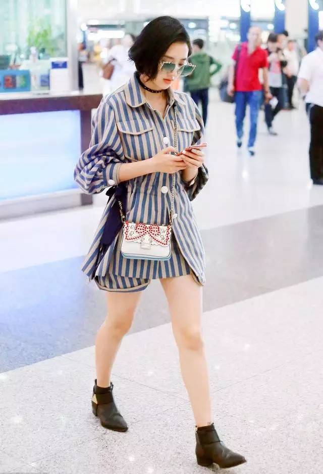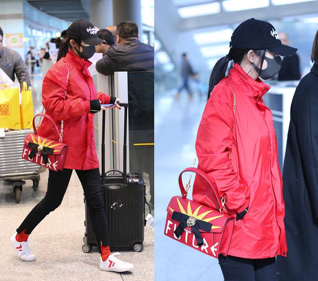 杨幂,红色外套搭配红色包包,虽然有点撞色,但是这蝴蝶结,真的是少女心爆棚啊!