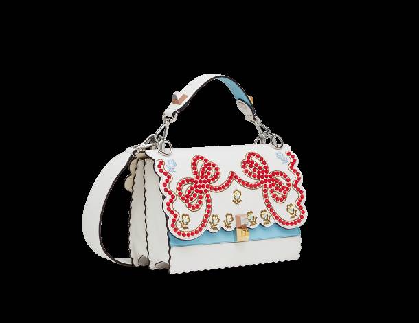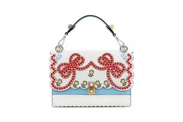 白色及浅蓝色皮革手袋,缀以对比鲜明的扇形边缘。翻盖缀有撞色刺绣和一个以红色立体贴花构成的浪漫蝴蝶结图案。特别设计的金属环,用于手袋挂饰及个性化装饰。