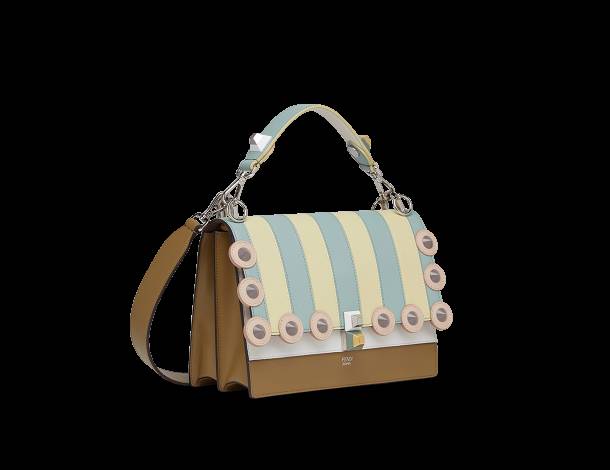 平纹皮革配上贝壳花边,撞色似的封边,又有着些许的俏皮。繁复的印花、真皮花卉装饰、蝴蝶结还有铆钉,加上Pequin条纹——细节、色彩、材质和工艺在这款包上达到完美平衡,这只有FENDI才能做到。以FENDI全新标志性方形铆钉——彩虹铆钉,作为独特的装饰锁扣,不仅起到点缀作用,方便的按扣,让手袋更为使用出挑。
