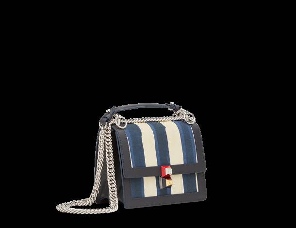 蓝白条纹棉质帆布手袋,小巧的方形设计,午夜蓝皮革镶边。设计的金属环,用于ABCLICK挂饰。