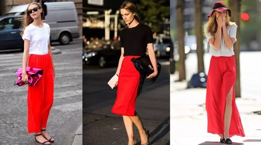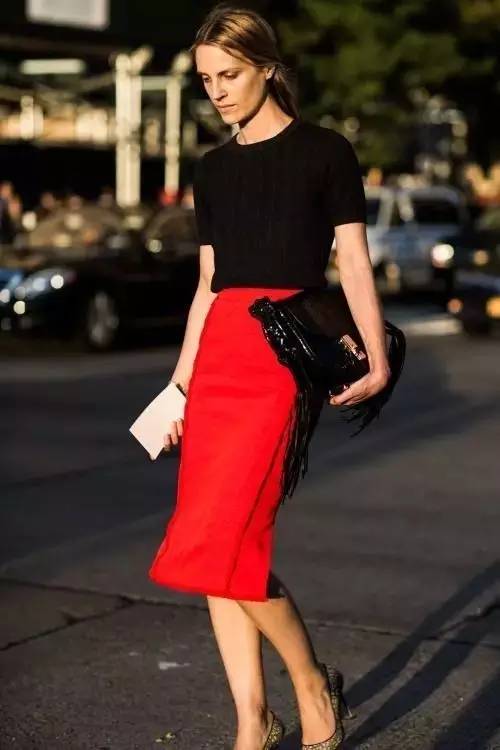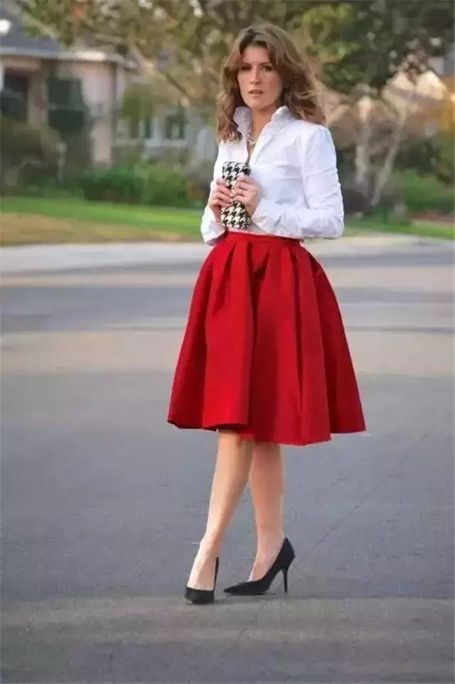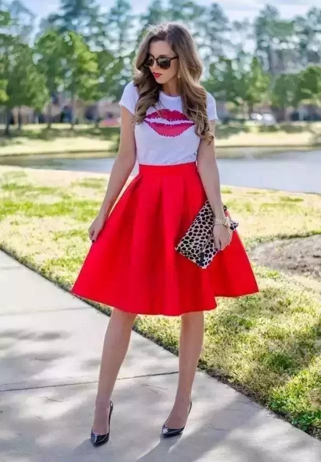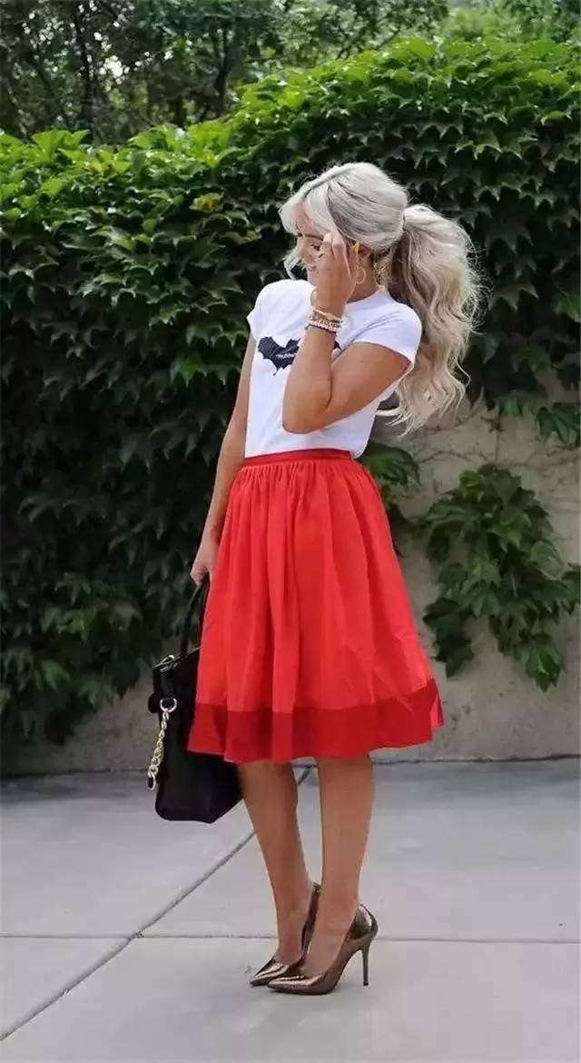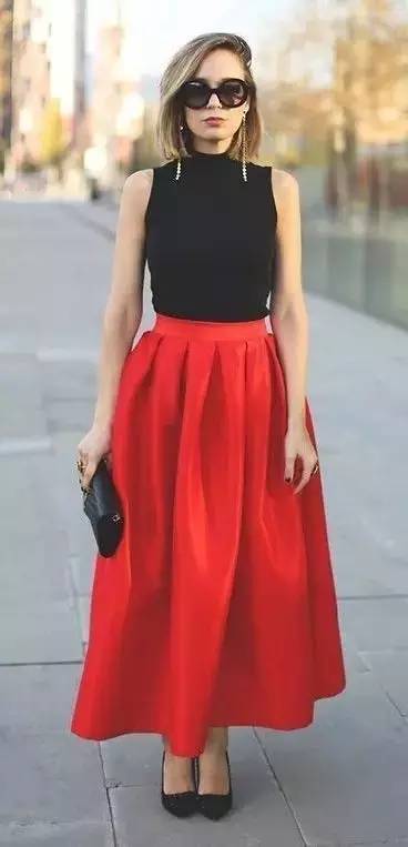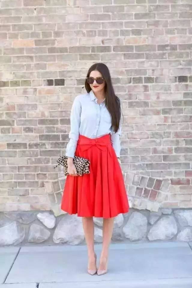红色半身裙跟什么颜色搭配才能搭出时髦感?一件白or黑的T恤/衬衫就可以搞定了,不需要多复杂,在简单中更凸显搭配技巧。