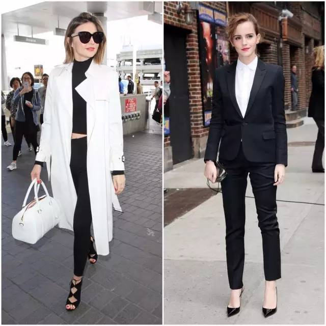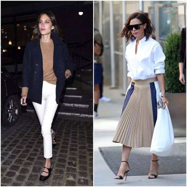 不约而同搭配了黑色细高跟鞋,是永不过时的法式风情。