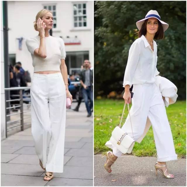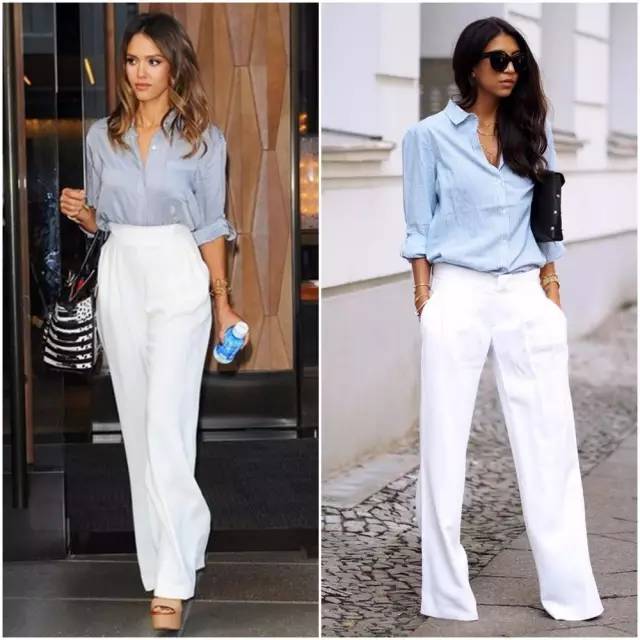 Alba和博主Kayla Seah都是这么穿的,高腰阔腿裤既能遮盖不完美腿型又不显胖,是最友好的白裤子。