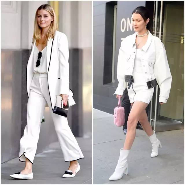 名媛的白西装和Bella Hadid的白外套,都是因为有了黑色镶边装饰,显得更高级。