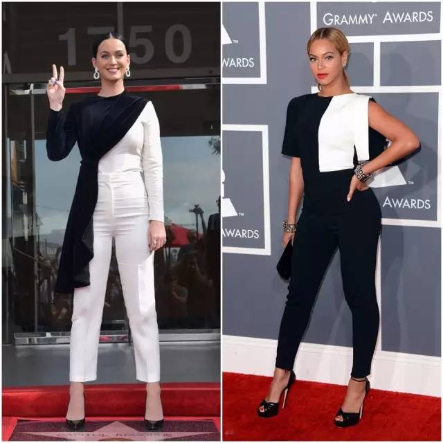 水果姐最近这一身就大获好评,跟碧昂斯之前格莱美穿过的黑白拼接连身裤是异曲同工之妙。