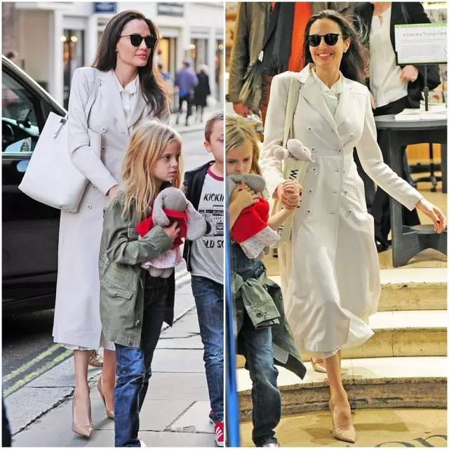 上个月在伦敦带着孩子逛街的朱莉,外套的白色调比内搭偏粉,顺理成章过渡到脚上的裸色高跟鞋,看上去十分温柔。